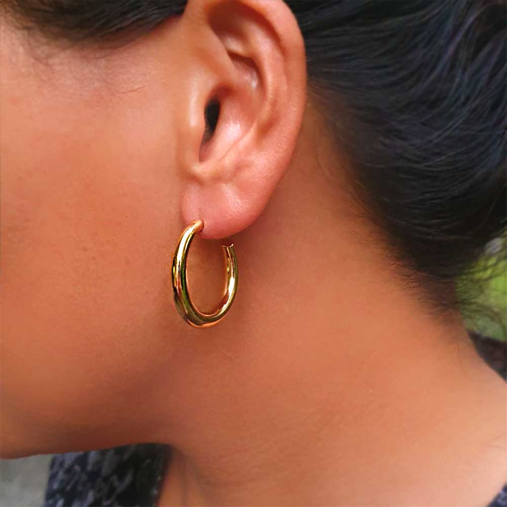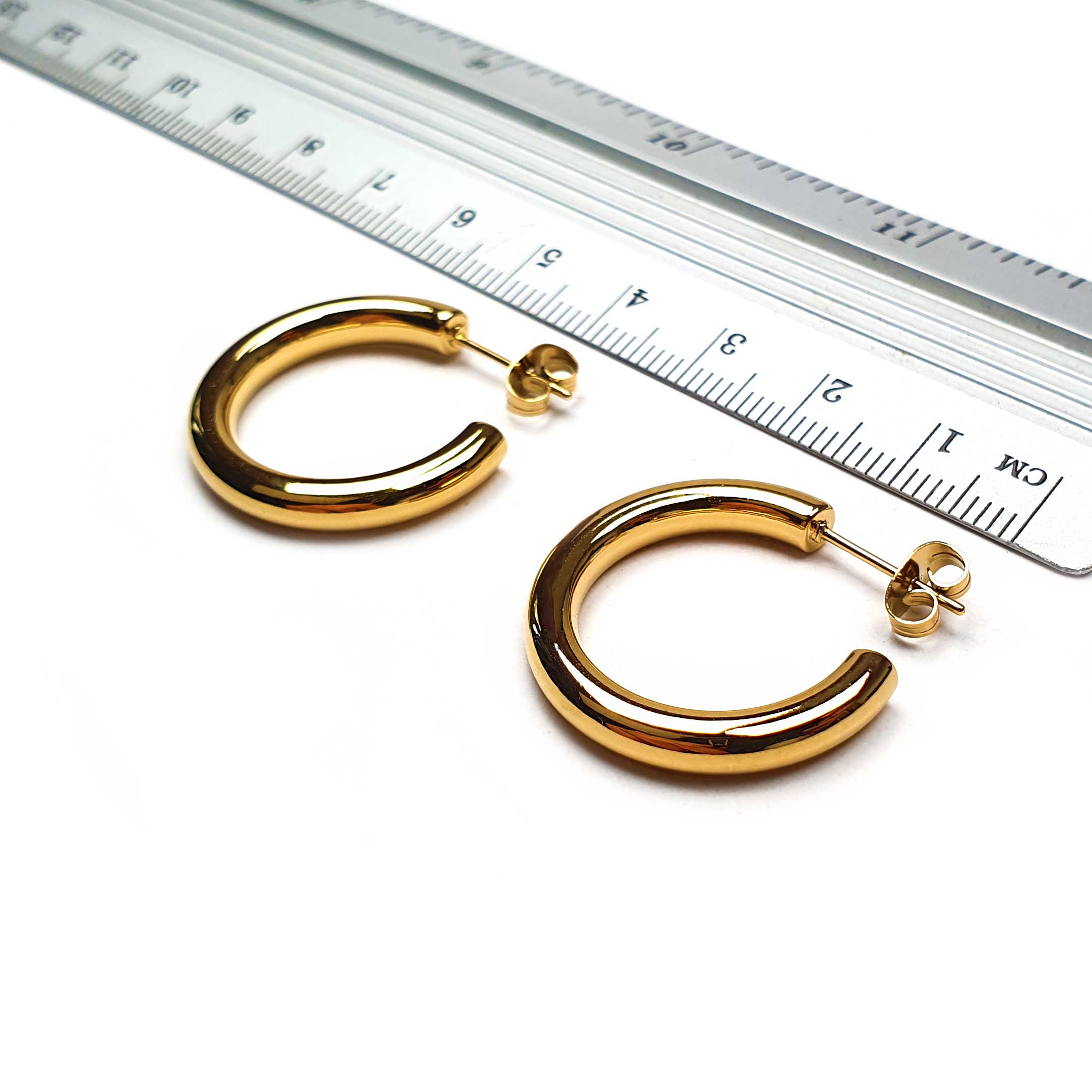 2424Diese hochwertigen edlen Creolen Ohrringe sind aus 14k vergoldetem Titanstahl gefertigt. Die Creolen haben einen Umfang von ca. 2,5 cm und werden mittels Ohrstecker befestigt. Der Ohrring ist durch sein Material und Verarbeitung sehr hautverträglich. Seine polierte Oberfläche wirkt elegant, schlicht und modisch zugleich.