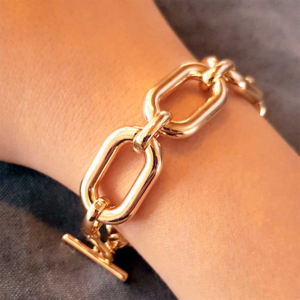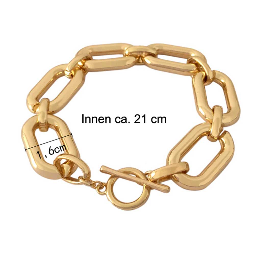 Ein wunderschönes Gold Armband im Big Chunky Style mit breiten goldenen Kettenglieder in 1,5 x 2,5 cm Größe. Das edle Armband ist trotz seiner Maße leicht und damit angenehm zu tragen. Mit ca. 21 cm Umfang passt es in als lockere oder straffe Variante an viele Handgelenk. Durch die Vergoldung und den massiven Look ist das Armband luxuriös und elegant im Style.